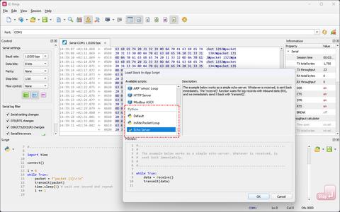 IO Ninja works with most interfaces and protocols you might come across — all flavors of serial, network, USB, and others. Its powerful logging engine is beautiful and lightning-fast. The built-in scripting facilities allow you to generate packets programmatically, react to incoming events, and create non-standard protocol analyzers.